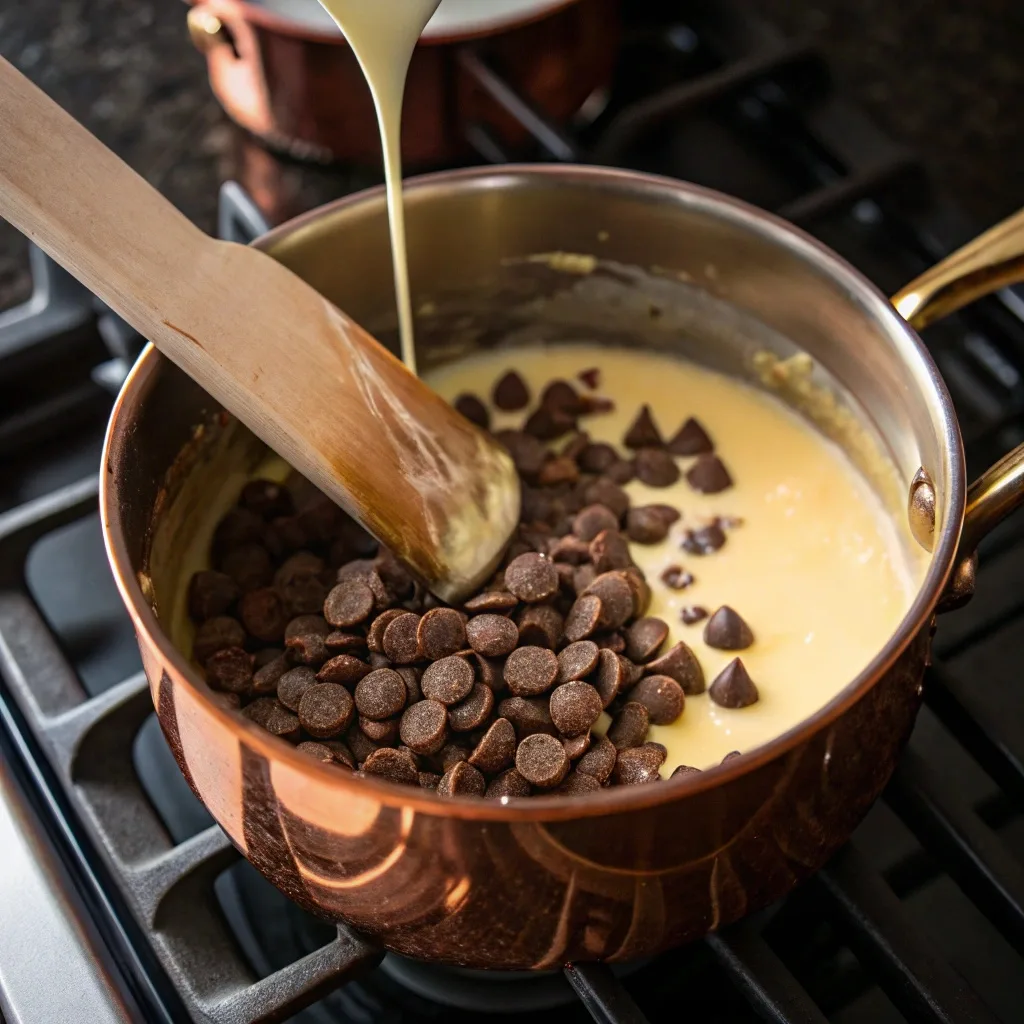 Gently stir the mixture with your spatula. You’ll notice the butter melting first, then the chocolate chips will begin to soften and pool. Keep stirring, scraping the bottom of the pan frequently. Don’t let the heat get too high, or the chocolate could scorch, giving you a grainy texture—we want silky smooth. After about 5 to 7 minutes of steady, gentle stirring, the mixture will become perfectly glossy, thick, and homogenous. It should look like liquid velvet!