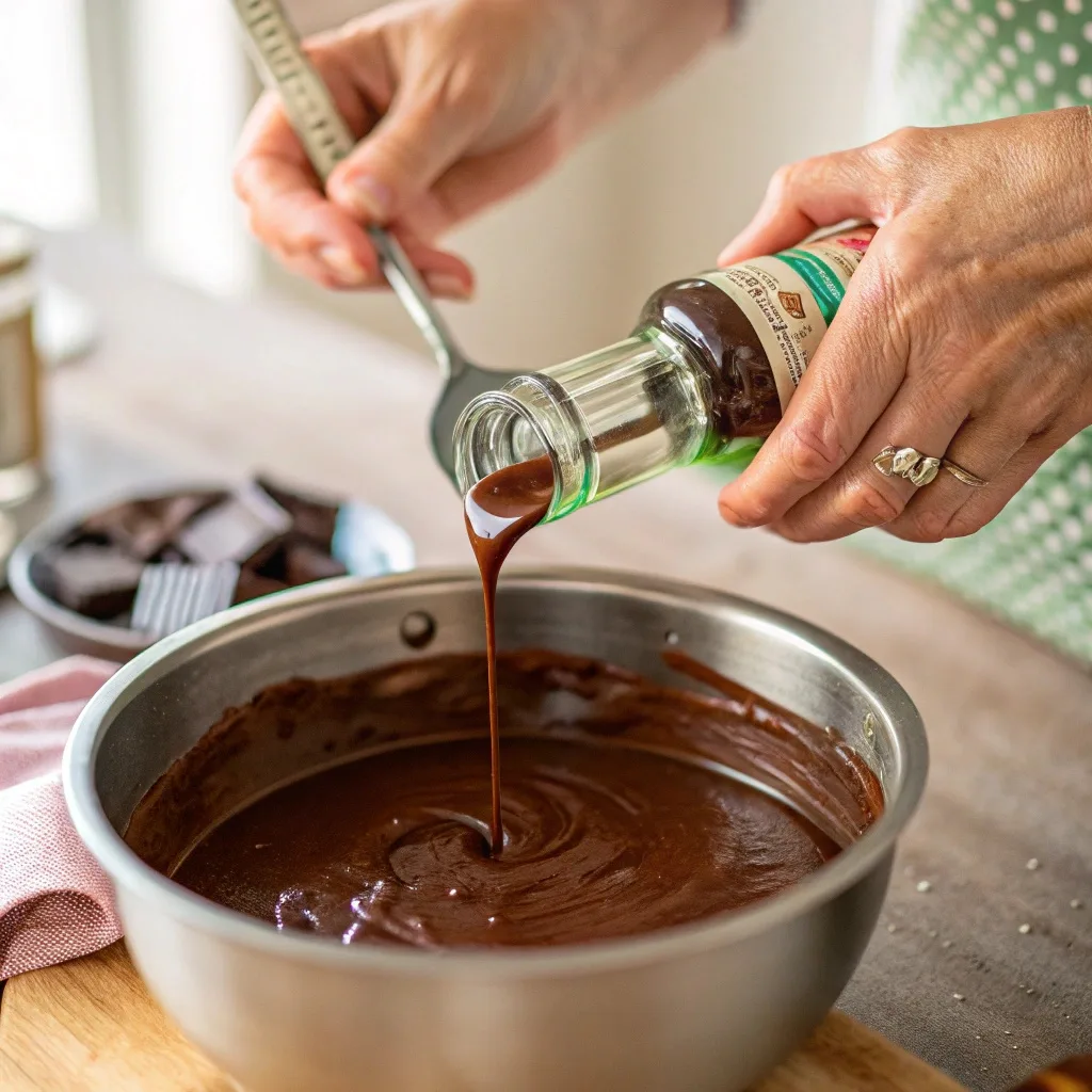 Remove the pan from the heat immediately. Stir in the vanilla extract and the peppermint extract (or oil). This scent explosion is absolutely thrilling! The cool, sharp aroma of the peppermint mixing with the deep, warm chocolate is one of my favorite kitchen smells all season. Stir well until the extracts are fully incorporated. I always sneak a tiny taste here—if you want more mint, add a tiny extra dash now.