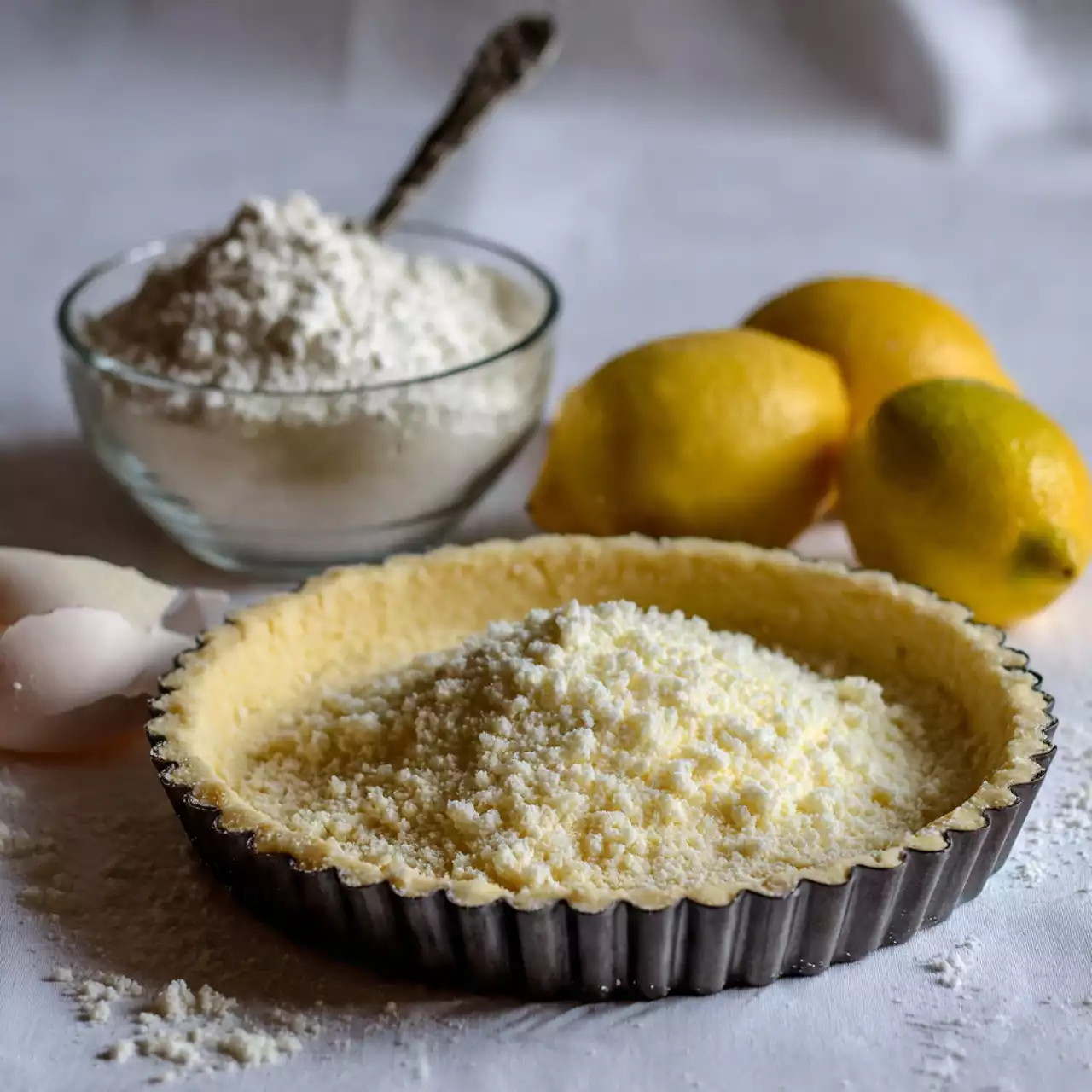 Begin by preheating your oven to 350°F (175°C). In a mixing bowl, combine the flour, softened butter, and powdered sugar. Mix until crumbly and press the mixture into the bottom of your tart pan.