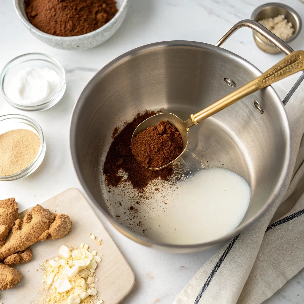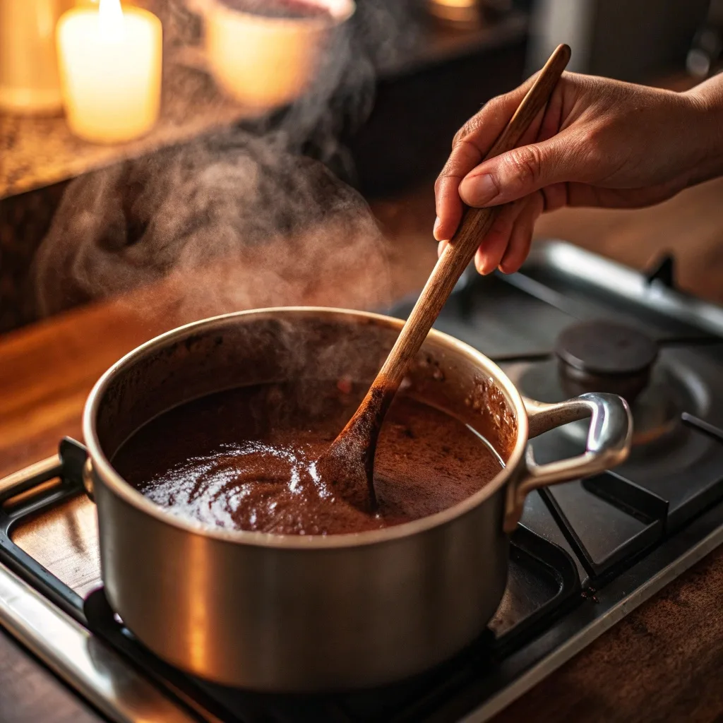 Place the saucepan over medium-low heat. Stir constantly, paying special attention to the bottom corners of the pot. As the liquid warms, the sugar and molasses dissolve, and those delicious spices awaken. I love this part—the smell that wafts up is an intoxicating mix of earthy chocolate and fiery ginger. Keep heating and stirring until you see steam rising, but do not let it boil. We want a gentle, simmering warmth.