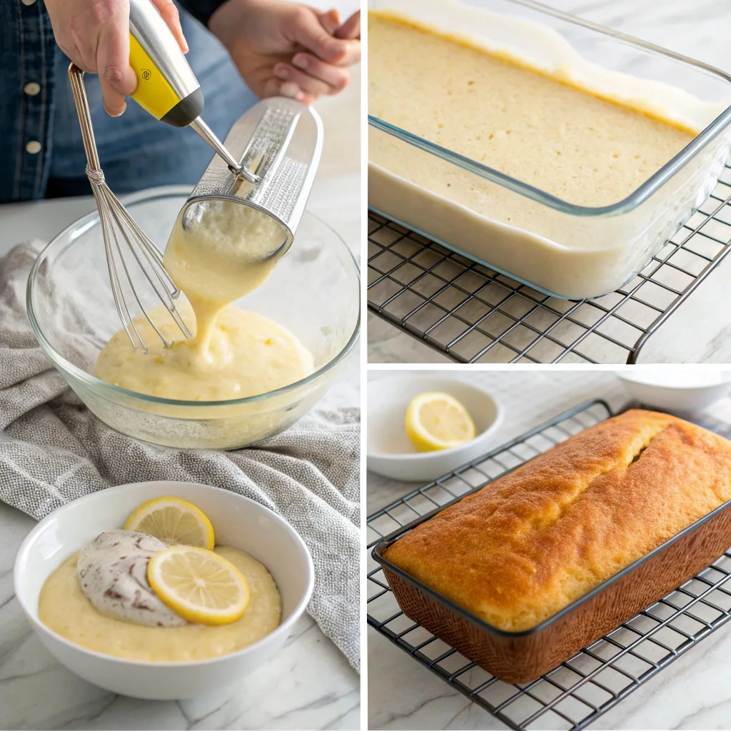 Alternate adding the dry ingredients and milk, mixing just until combined. Pour the batter into your prepared pan and bake for 45–50 minutes, or until a toothpick inserted in the center comes out clean. Let it cool before drizzling the glaze over the top. The result? A moist, buttery loaf bursting with lemony goodness in every bite.