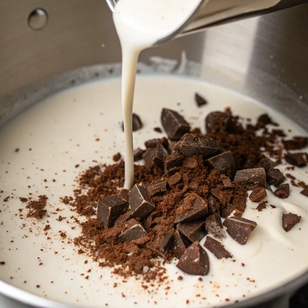 - Melt the Chocolate: As soon as the milk mixture is steaming and you see tiny bubbles forming around the edges (it should not boil!), toss in your finely chopped dark chocolate. Keep the heat on medium-low and continue to whisk gently but consistently.
