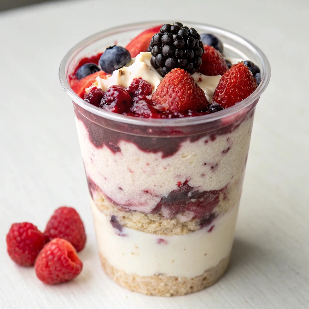 The taste is a delightful harmony of creamy tanginess from the yogurt, a touch of sweetness from the cheesecake layer, and a burst of juicy berry goodness, making every bite a delightful experience.