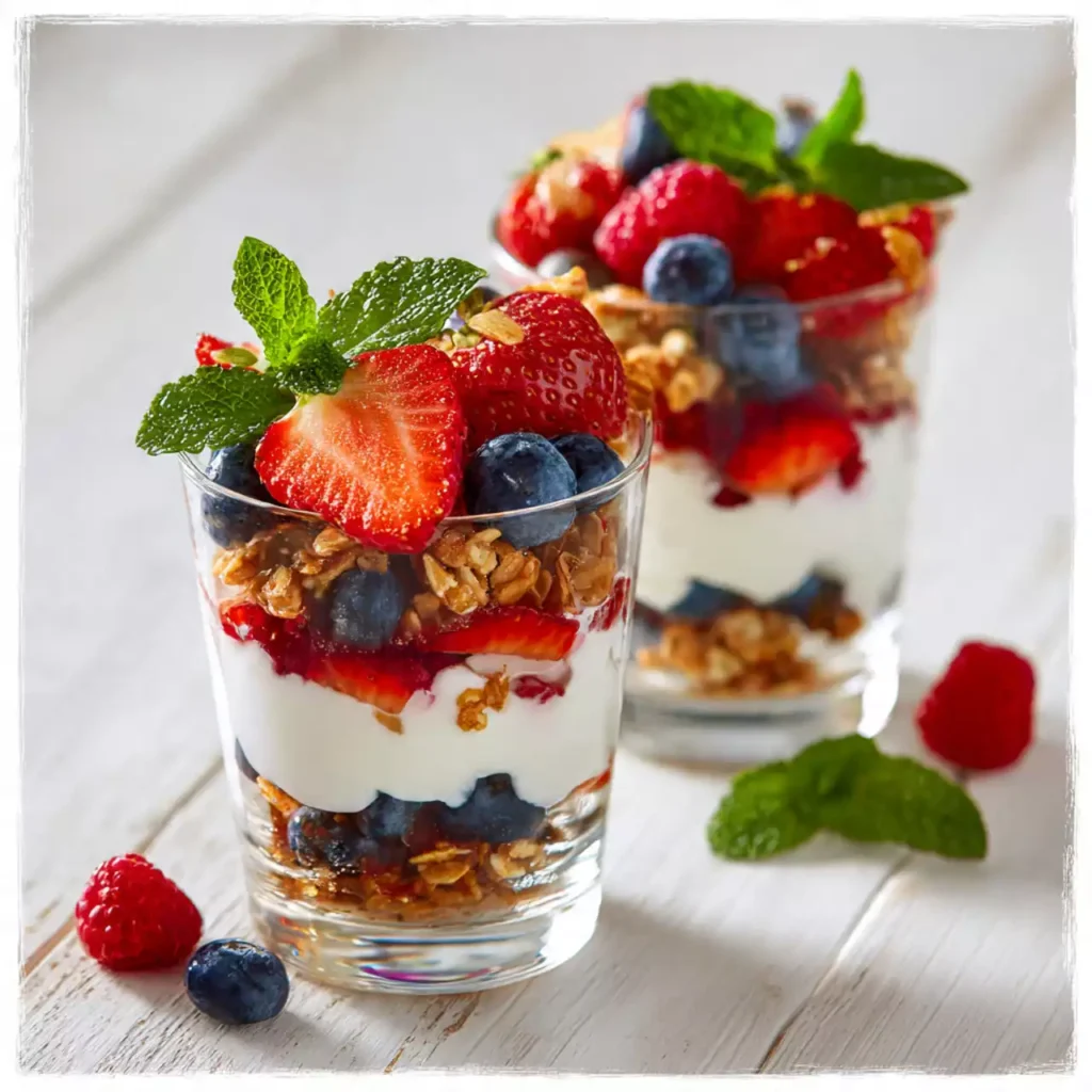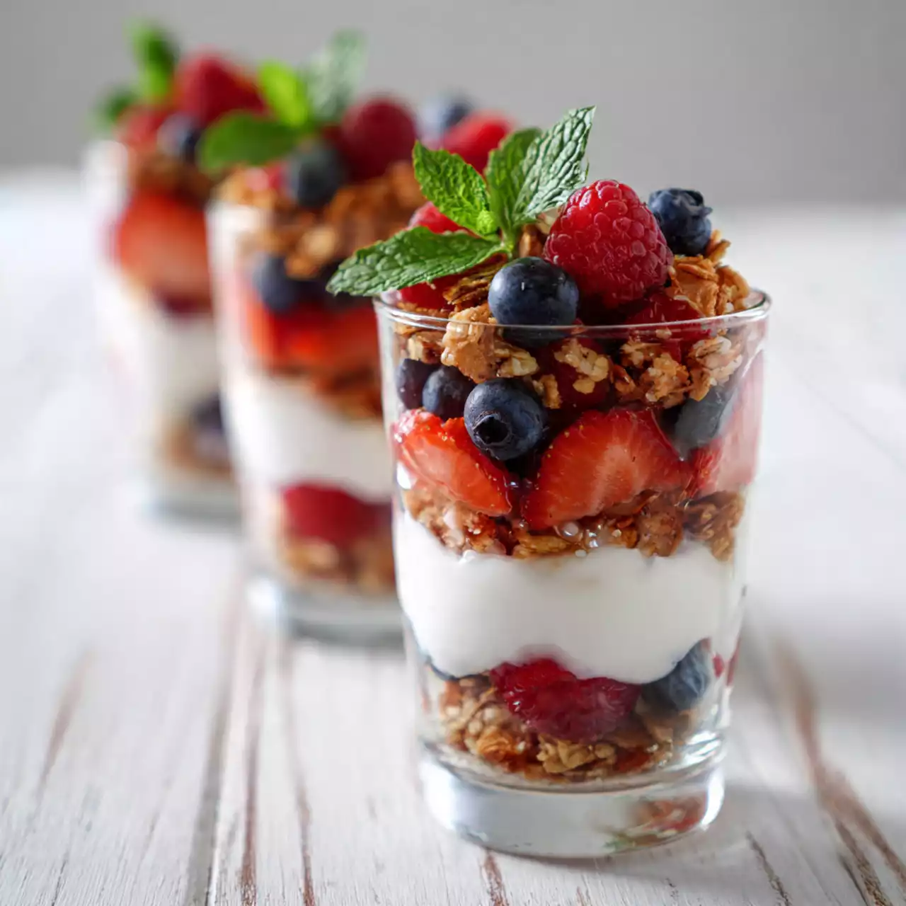 Now comes the fun part – assembling the parfaits! In your clear parfait glasses or bowls, start by spooning a layer of yogurt at the bottom. Then, add a handful of your favorite fruits, followed by a sprinkle of granola. Repeat the layers until your glasses are full, finishing with a sprinkle of granola on top for that satisfying crunch. Don’t forget to garnish with fresh mint leaves for a pop of color!