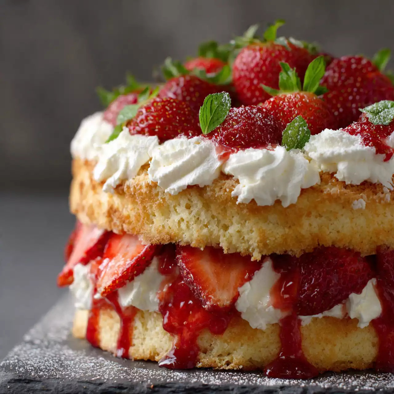 Once the cakes are cool, remove them from the pans. Place one layer on your serving platter and generously spread a layer of whipped cream over it. Scatter a portion of your sliced strawberries on top. Add the second layer of cake and repeat the process with more cream and strawberries. Feel free to pile on the whipped cream and strawberries—this is the fun part!