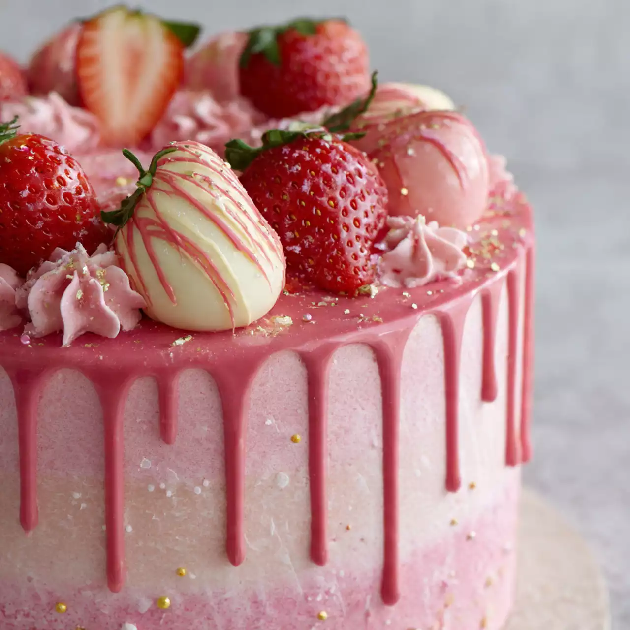 7 Melt white chocolate and cream together until smooth. Stir in pink coloring. Spoon or pipe the drip along the top edge of the cake, letting it cascade naturally.