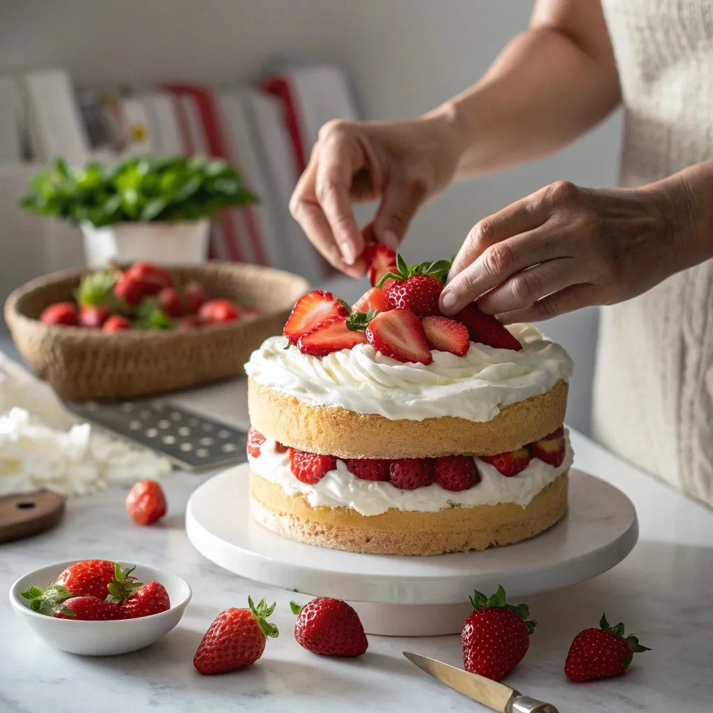 For themed occasions like a strawberry shortcake birthday party, decorate the top with piped cream rosettes and scatter extra berries for a charming strawberry cake aesthetic.