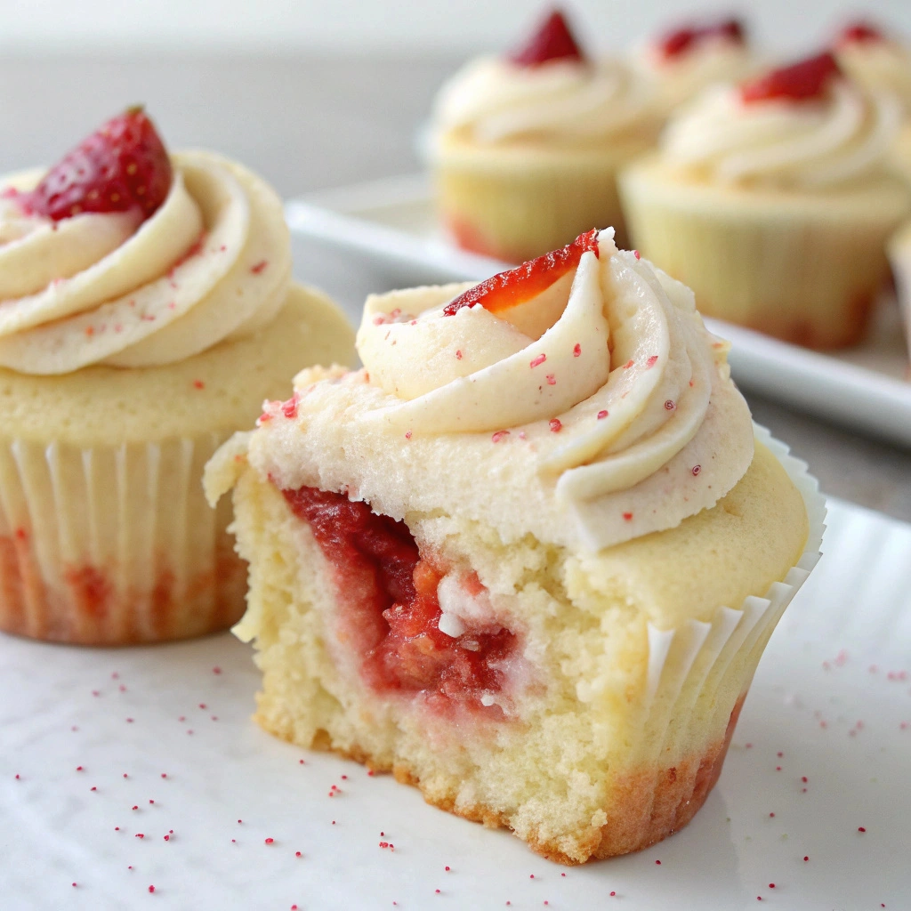 In a small saucepan over medium heat, combine the diced strawberries, granulated sugar, lemon juice, and cornstarch. Stir gently until the mixture comes to a simmer and the strawberries soften, about 5–7 minutes. Remove from heat and let cool. This will create a sweet and tangy filling that contrasts beautifully with the vanilla cupcakes.